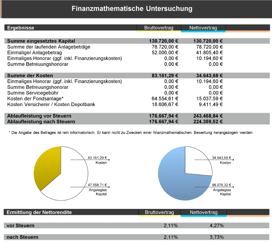Analyse: Wir decken alle zukünftig anfallenden laufenden und versteckten Kosten auf – inklusive TER, TAK (Transaktionskosten), Kickbacks und mehr. In diesem Fall summierten sich diese auf stolze 83.161 €