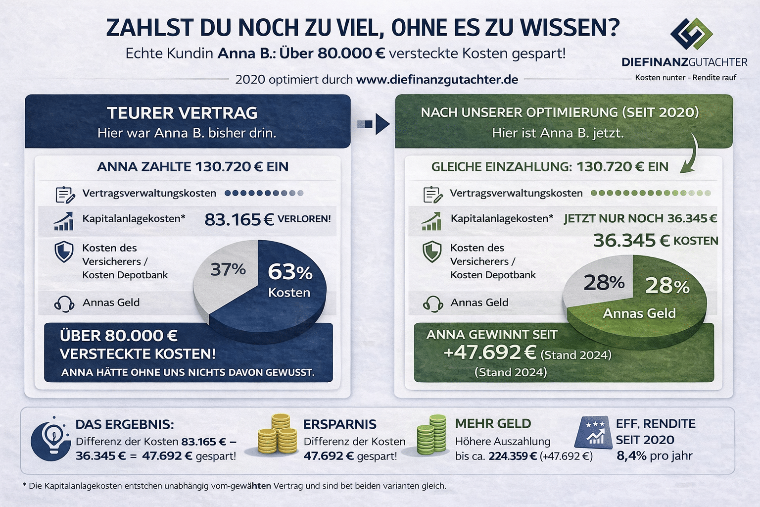 Ergebnis: Seit März 2020 weniger Systemgebühren = sofort mehr Vermögen. Schon wenige Jahre nach der Optimierung beschleunigte sich Annas Wertentwicklung. Ihre Endauszahlung schießt von 176.667 € auf 224.359 € hoch. Ihr Vorteil: Ein Gewinn von +47.692 € – bei identischer Sicherheit und gleichem Aufwand.